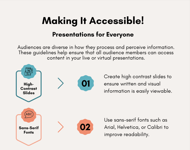 An infographic offering guidance on making written and visual content accessible for all in a live, virtual, or recorded presentation.